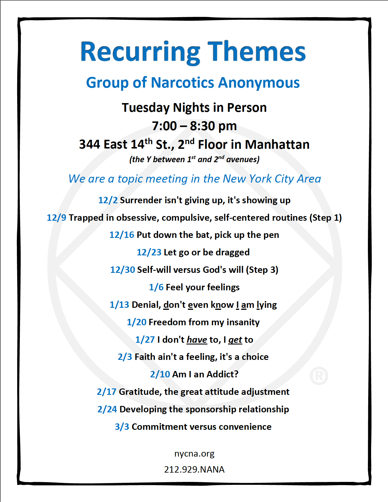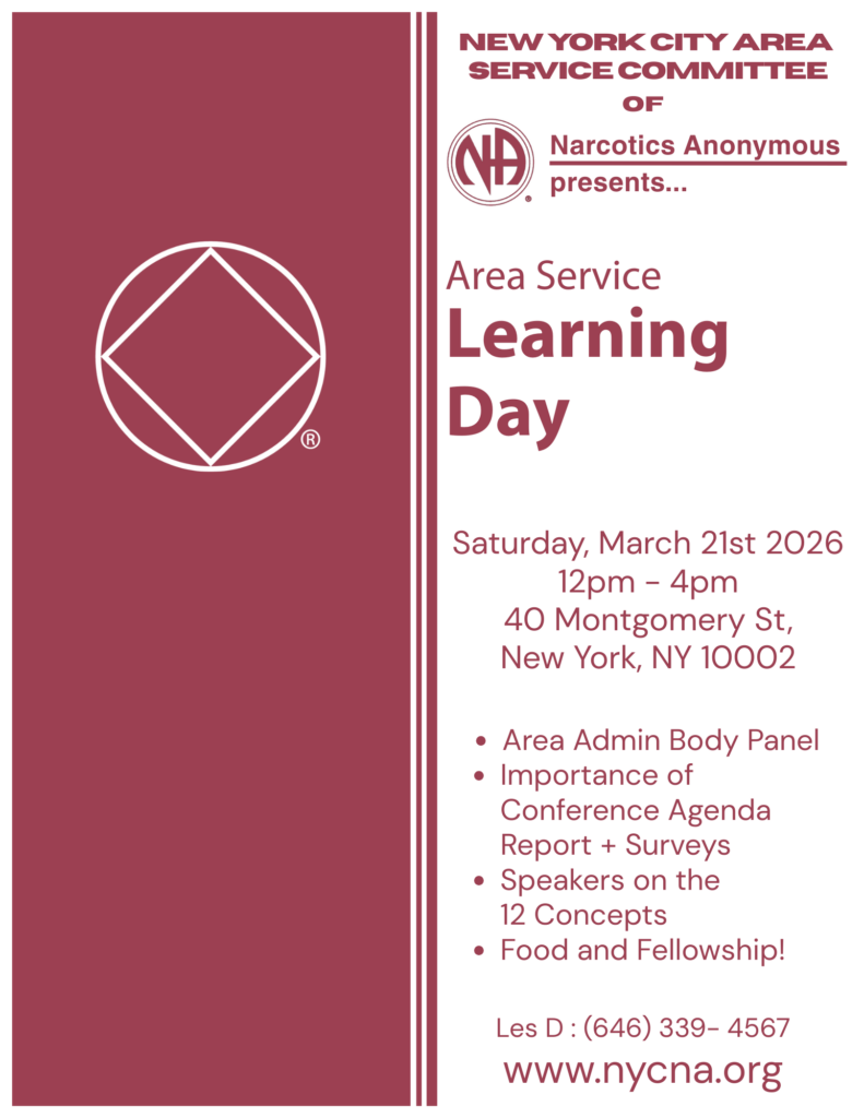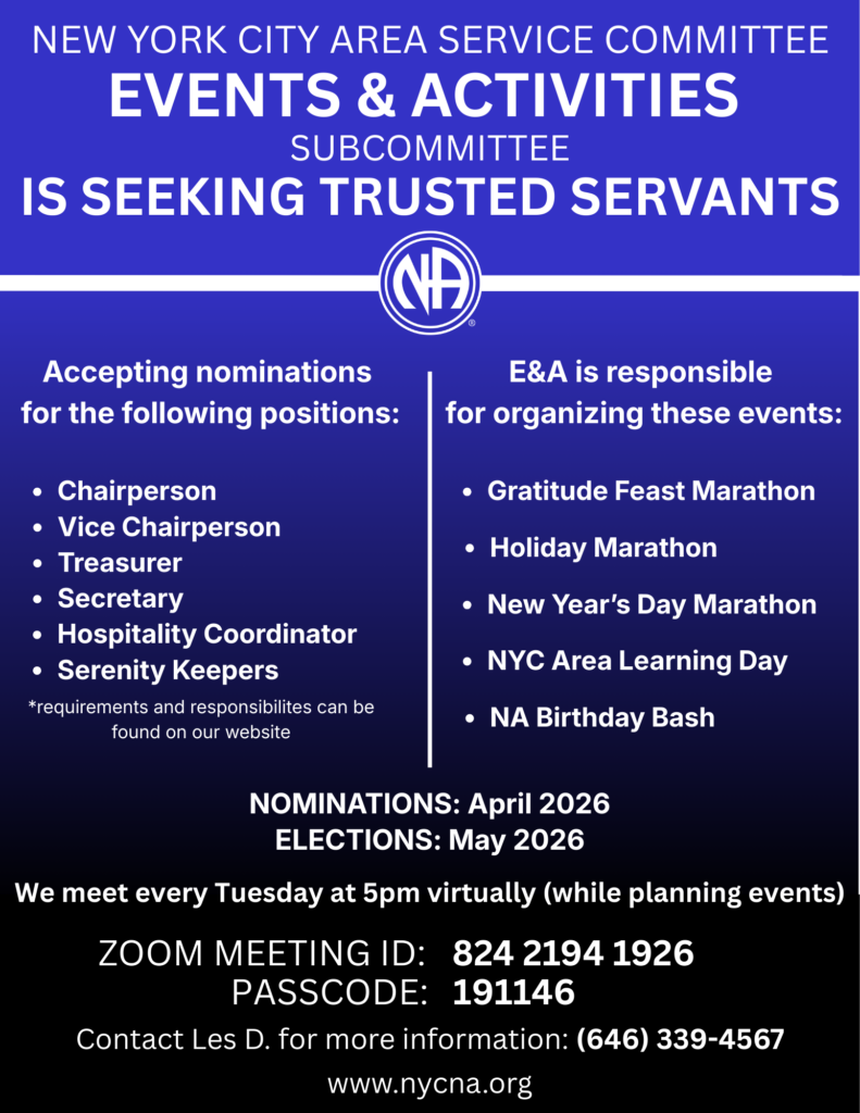 All are welcome to attend the Subcommittee Meeting; 6 months clean to begin training, 1 year clean time to become a Panel Leader. For more information, please contact handi@nycna.org